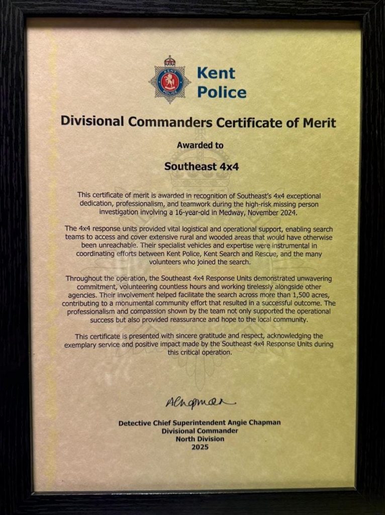 Exciting news!! We have been given a Divisional Commander’s Certificate of Merit by Detective Chief Superintendent, Angela Chapman, for the support South East 4x4 Response provided during the search for a 16 year old boy in November 2024. Well done to those members of the teams who were out over two weekends providing transport during the extensive search.
